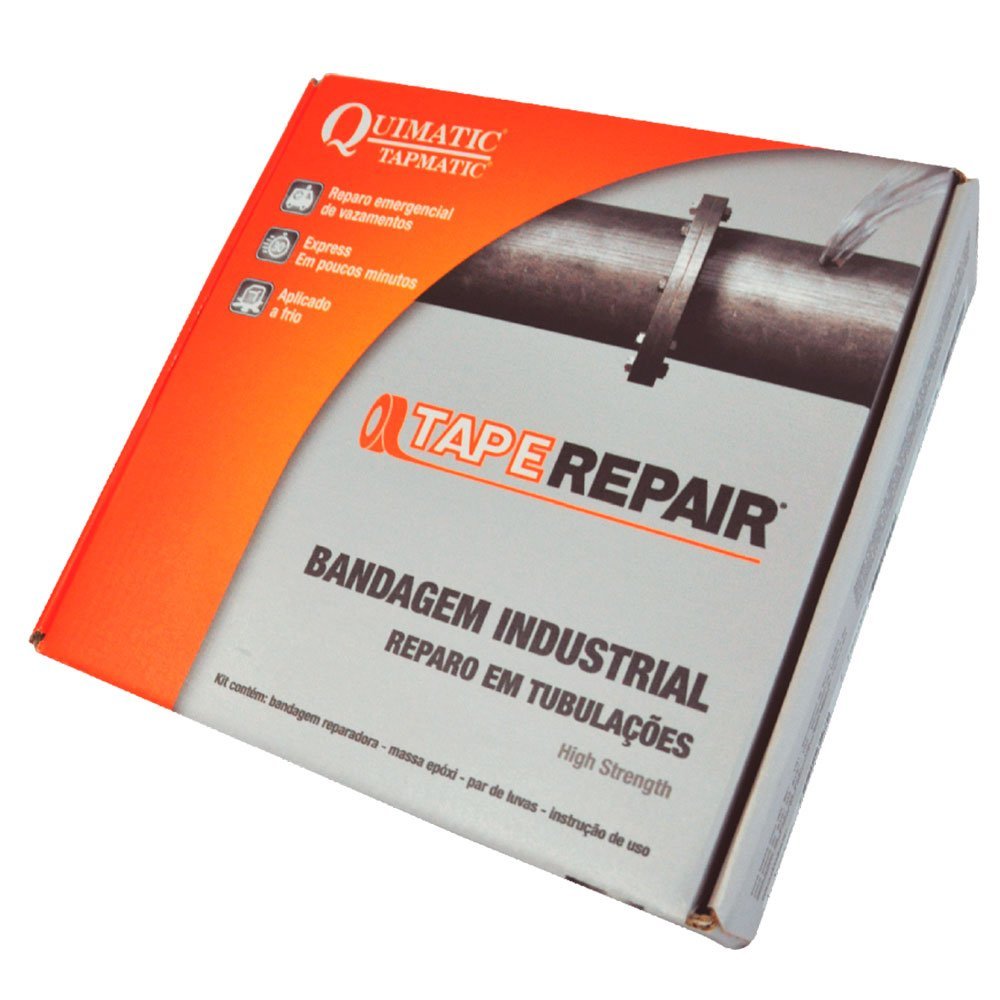 Taperepair é uma bandagem indicada para reparos devazamentos em tubulações. Trata-se de um kit emergencial, constituído por uma massa epóxi e uma bandagem impregnada com resina hidroativada. Indicado para estancar vazamentos de tubulações, em situações de emergência, mesmo com o fluido vazando em baixa pressão. Utilizado em tubulações nos setores químico, oil & gas, mineração, agrícola, metal-mecânico, saneamento e demais indústrias. Pode ser aplicada sobre metal, aço inox, PVC, cobre, fibra de vidro, concreto, cerâmica, poliéster, entre outros.