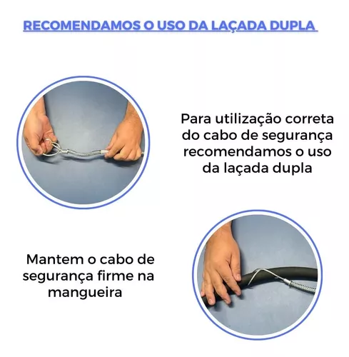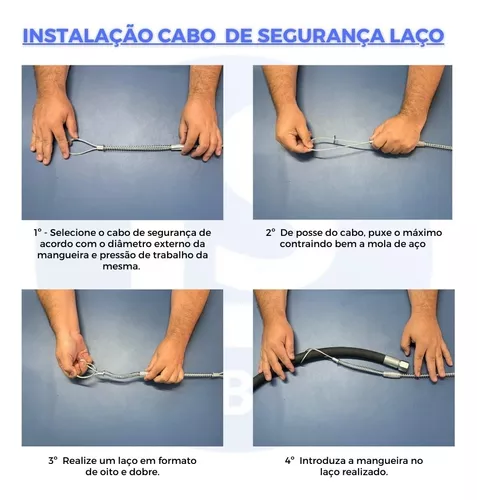 A instalação do cabo de segurança / antichicoteamento é fácil e não requer ferramentas. O cabo de segurança tem laços com molas que são abertos e deslizados sobre cada mangueira para fornecer um aperto firme na mangueira e evitando que ela gire durante um acidente.